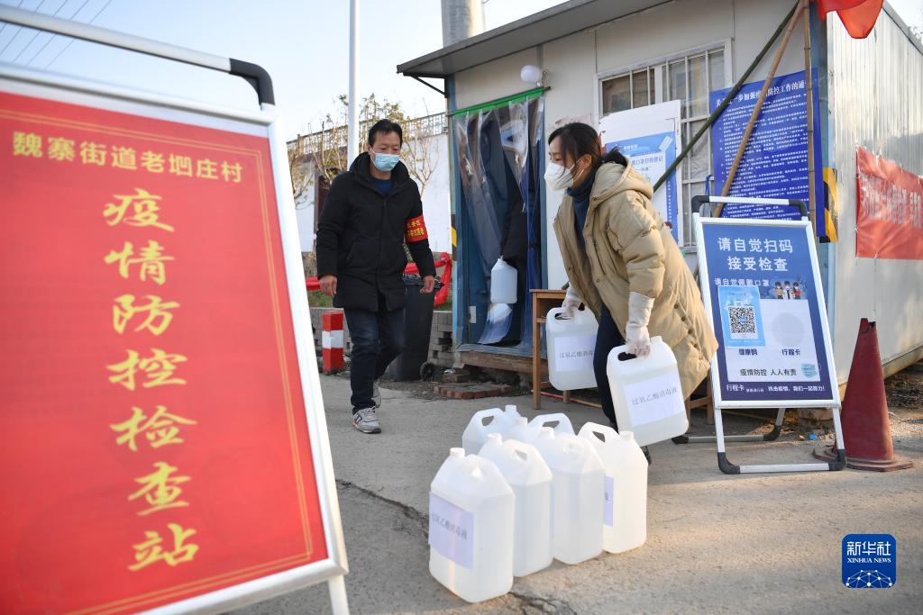 2021年12月31日,王卫花(右)向西安市长安区魏寨街道老垇庄村捐赠防疫物资。王卫花是西安市长安区职业农民协会会长、果优特种植专业合作社负责人。本轮疫情发生以来,她积极向农村防疫一线捐赠防疫物资和水果,帮助农户协调解决农产品销路和运输问题,避免农户遭受损失。