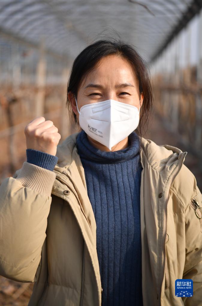 2021年12月31日,西安市长安区职业农民协会会长、果优特种植专业合作社负责人王卫花在自家果园内为西安加油。