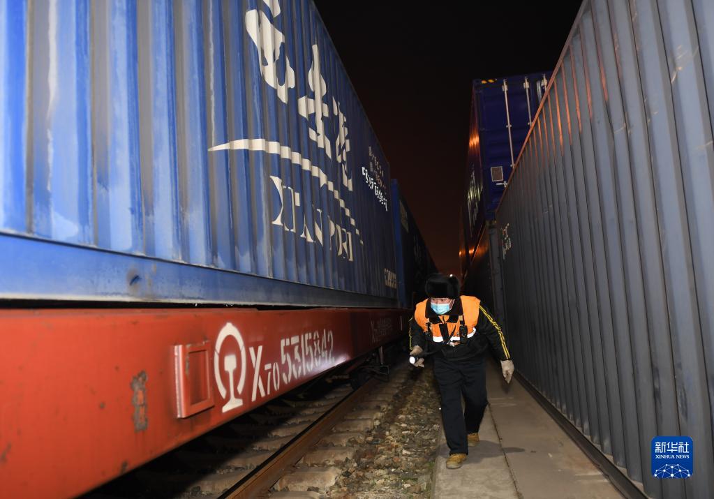 2021年12月31日深夜,中国铁路西安局西安国际港站调车长周俊玺例行检查中欧班列长安号车列情况。2022年1月1日零时,中欧班列长安号新年首列开启新路线,为保障车辆安全运行,周俊玺在岗位上迎接新年到来。