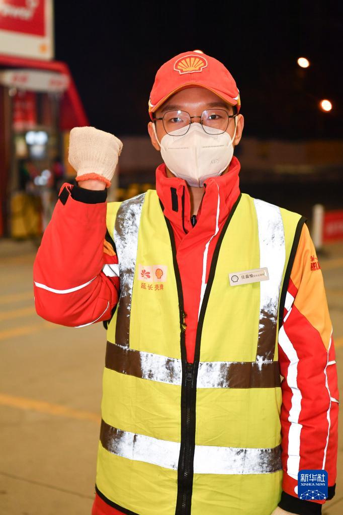 2022年1月1日凌晨,延长壳牌石油有限公司西安曲江雁翔路加油站工作人员任晨愉在工作岗位上为西安加油。