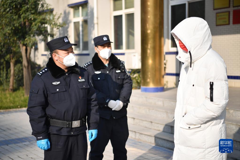 2022年1月1日,西安市公安局高新分局丈八路派出所民警何磊(左)在丈八路派出所内向一位电信诈骗受害人了解情况。自本轮疫情发生以来,何磊与同事既负责社区管控封控、核酸检测点的秩序维持工作,又要完成出警等日常值班任务。
