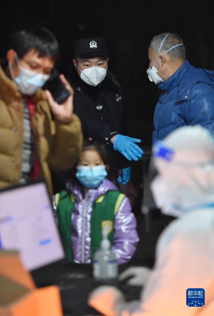 2021年12月31日,西安市公安局高新分局丈八路派出所民警何磊(后排中间)在高新区一小区的核酸检测点维持排队秩序。自本轮疫情发生以来,何磊与同事既负责社区管控封控、核酸检测点的秩序维持工作,又要完成出警等日常值班任务。