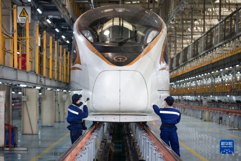 1月1日,南京动车段南京南动车运用所的地勤机械师在检查维护动车组列车。