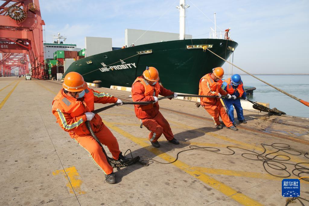 1月1日,在江苏连云港港集装箱码头,工人给一艘船舶带缆。
