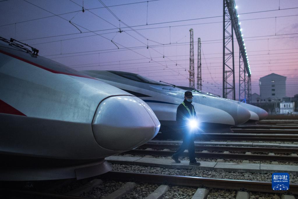 1月1日,武汉动车段地勤机械师李宇豪在存车场进行巡视作业。