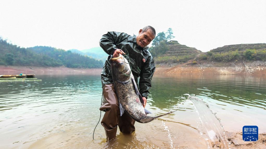 当日是新年第一天,湖南省衡阳市常宁市官岭镇西塘村的村民在水库中捕鱼,丰富假日期间的菜篮子,庆祝新年的到来。