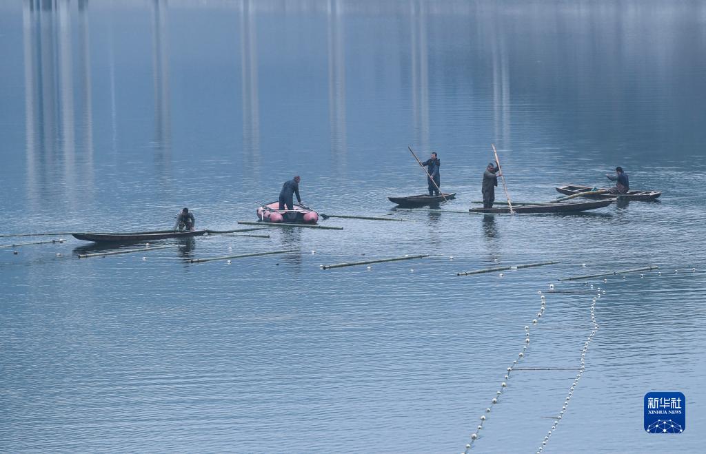 当日是新年第一天,湖南省衡阳市常宁市官岭镇西塘村的村民在水库中捕鱼,丰富假日期间的菜篮子,庆祝新年的到来。