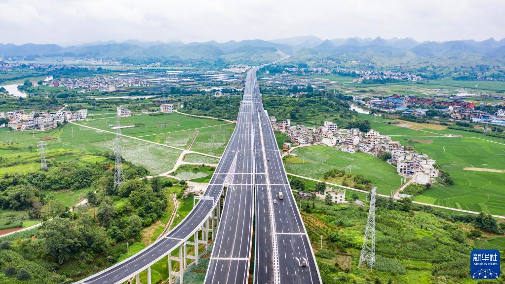 车辆行驶在贵州都匀至安顺高速公路惠水大桥上(2021年6月28日摄,无人机照片)。