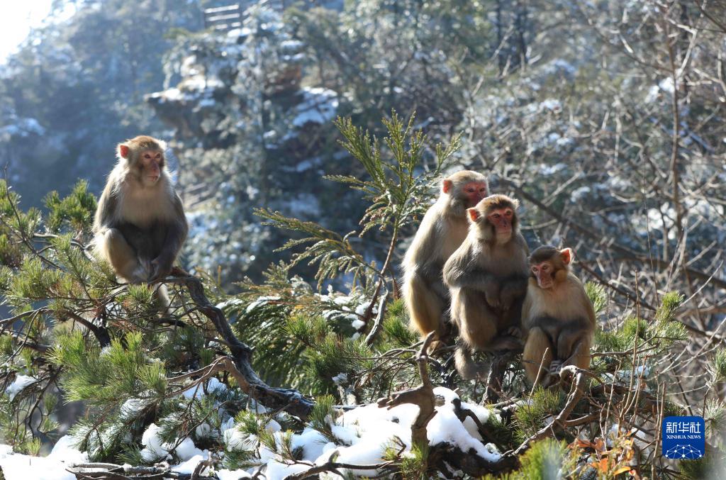 雪后初霁,在湖南张家界武陵源景区黄石寨,成群结队的野生猕猴或歇息养神,或行走觅食,憨态可掬,为景区增添了不少乐趣。