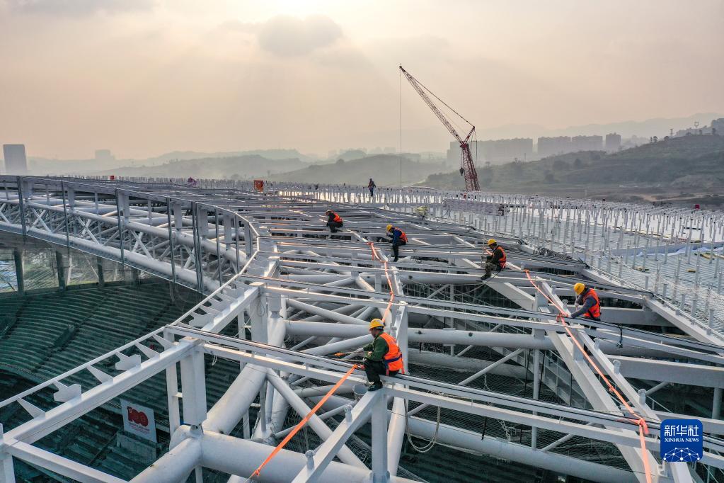 2022年1月1日,施工人员在重庆龙兴足球场进行屋面施工(无人机照片)。