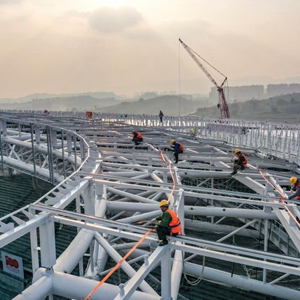 当日是新年第一天,在中建八局承建的重庆龙兴足球场施工现场,工作人员有条不紊地进行金属屋面及幕墙装饰作业。