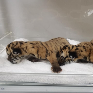 广东韶关华南虎繁育研究基地华南虎“梦梦”产下的两只华南虎幼崽(2022年1月1日摄)。新华社发