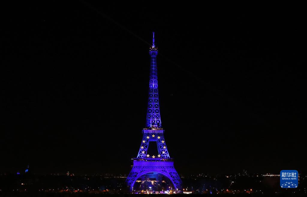 2022年1月1日,法国巴黎埃菲尔铁塔被蓝色灯光点亮。当日,法国首都巴黎及其他城市的地标建筑相继点亮象征欧盟旗帜颜色的蓝色,庆祝法国轮任欧盟主席国。2022年1月1日起,法国接任欧盟理事会轮值主席国,为期半年。新华社记者 高静 摄