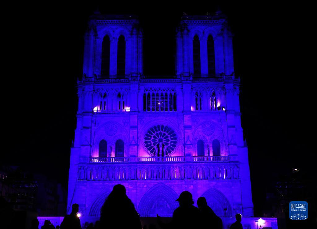 2022年1月1日,法国巴黎圣母院被蓝色灯光点亮。新华社记者 高静 摄