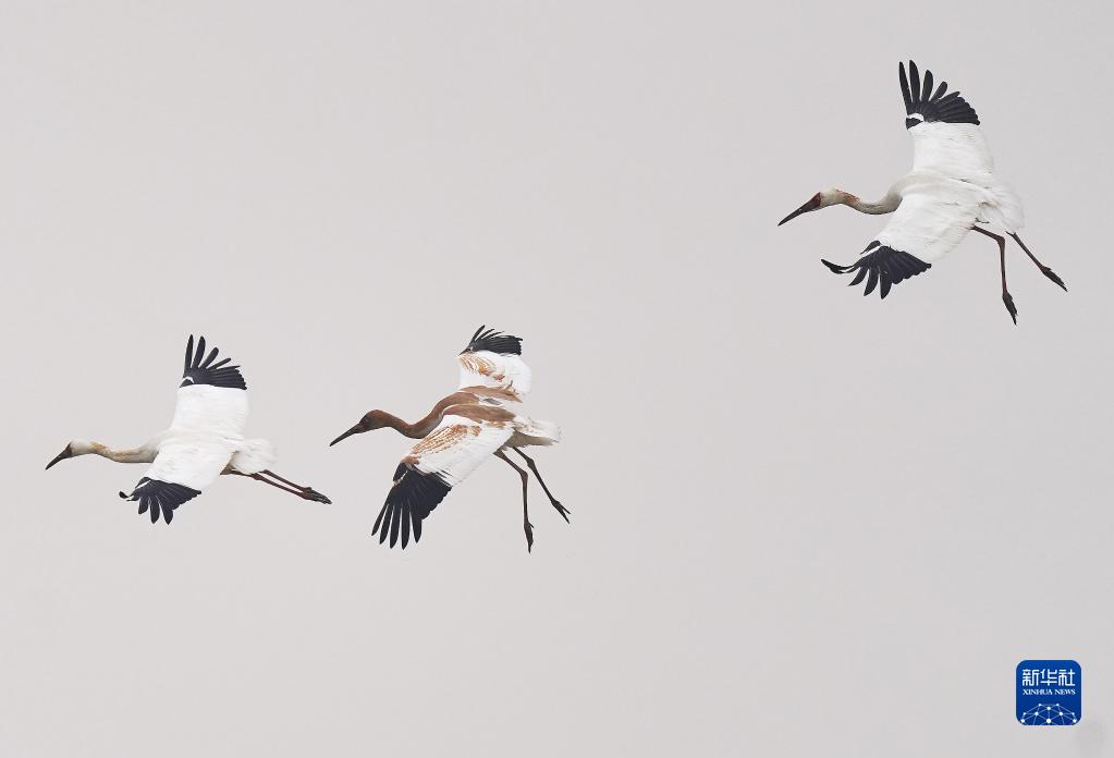 白鹤在湿地上空飞舞(1月1日摄)。新年伊始,在位于鄱阳湖畔的南昌高新区鲤鱼洲管理处五星白鹤保护小区里,来此越冬的国家一级保护鸟类白鹤展翅起舞,姿态万千。新华社记者 万象 摄