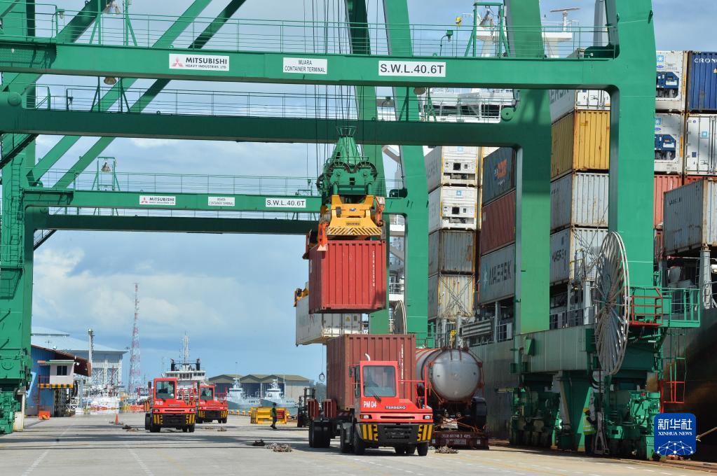 这是2022年1月1日拍摄的正在进行集装箱装卸作业的文莱摩拉港码头。文莱摩拉港由中国和文莱合资企业——摩拉港有限公司运营。2022年1月1日,区域全面经济伙伴关系协定(RCEP)生效实施。新华社发(杰弗里·黄摄)