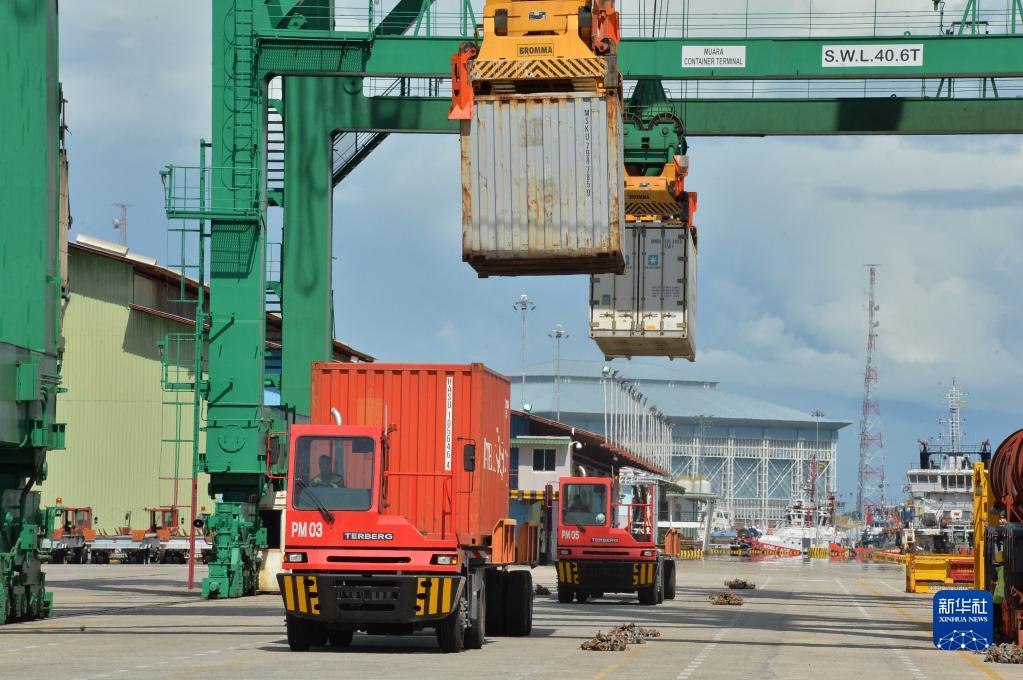 这是2022年1月1日拍摄的正在进行集装箱装卸作业的文莱摩拉港码头。文莱摩拉港由中国和文莱合资企业——摩拉港有限公司运营。新华社发(杰弗里·黄摄)