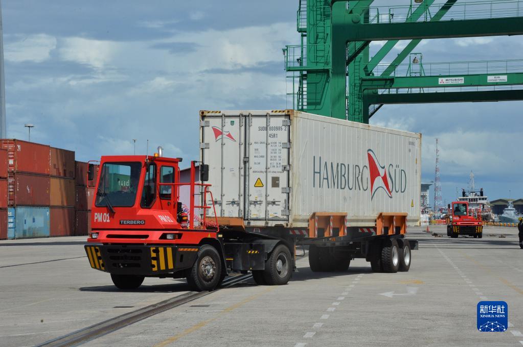 2022年1月1日,车辆在文莱摩拉港码头运输集装箱。文莱摩拉港由中国和文莱合资企业——摩拉港有限公司运营。新华社发(杰弗里·黄摄)