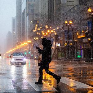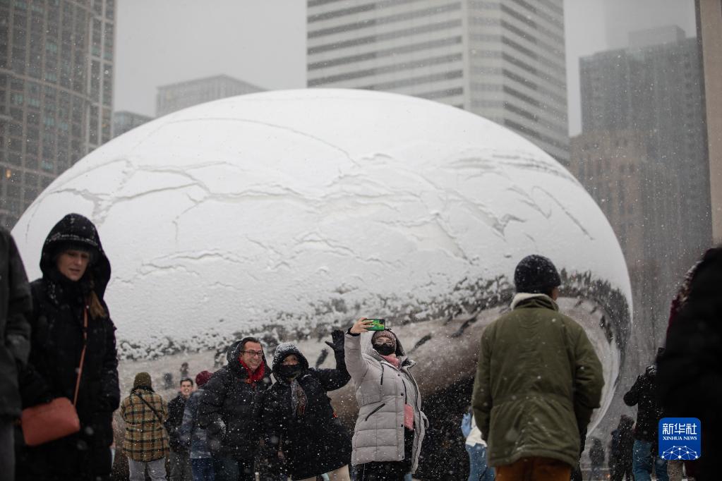 2022年1月1日,人们在美国芝加哥的雕塑“云门”前拍照。当日,美国芝加哥遭遇冬季风暴。新华社发(文森特·约翰逊摄)