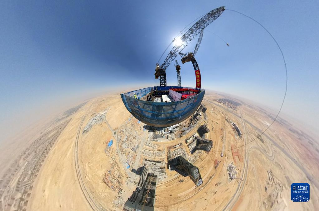 这是2021年6月17日在埃及开罗附近拍摄的埃及新行政首都中央商务区标志塔(全景相机拍摄)。埃及新行政首都中央商务区位于首都开罗以东约50公里处,由中国建筑股份有限公司埃及分公司承建。
