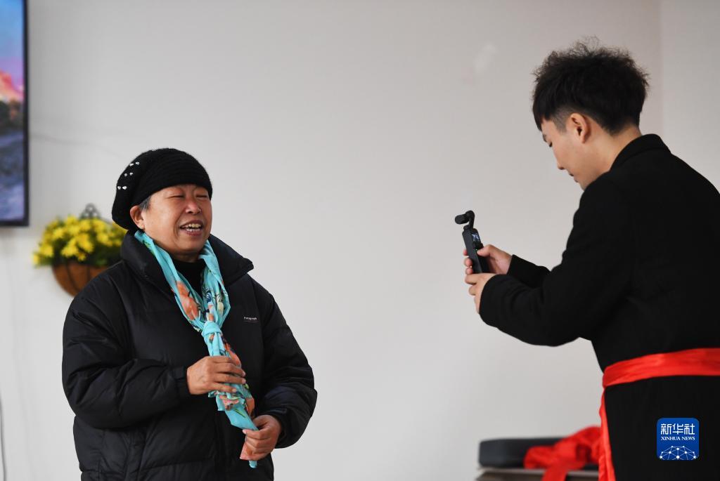 2021年12月31日,在位于许昌市魏都区的福瑞园养老院,樊金林(右)在元旦联欢会上拍摄老人唱歌。