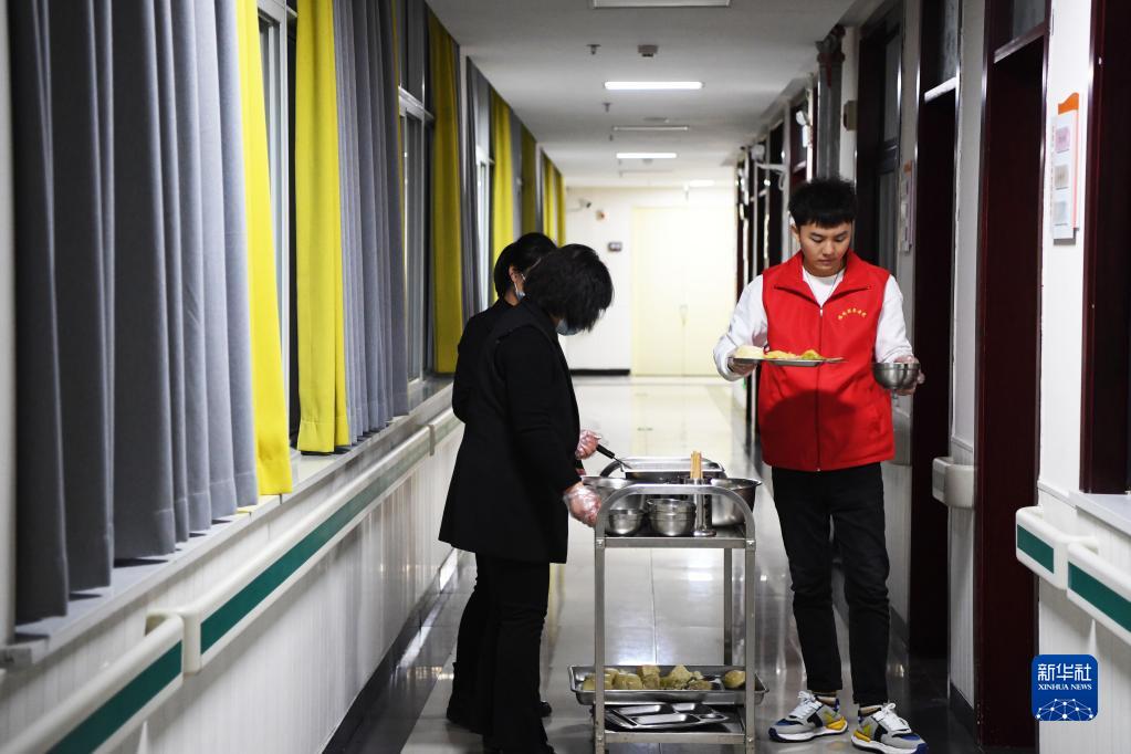 2021年12月30日,在位于许昌市魏都区的福瑞园养老院,樊金林(右)给老人送晚餐。
