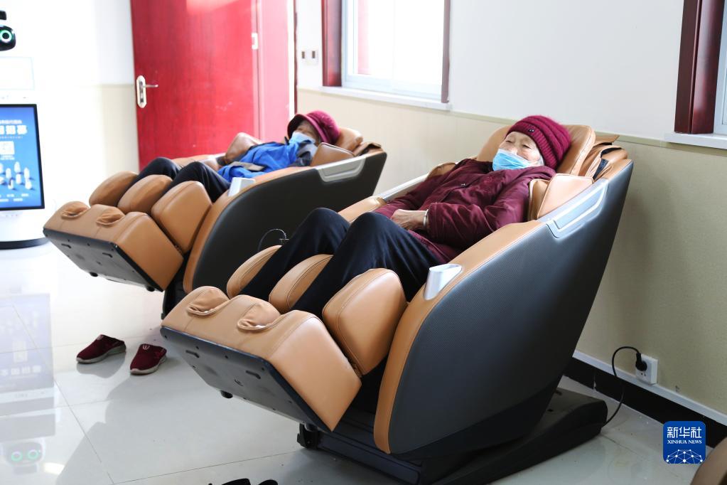 2021年12月30日,在位于许昌市魏都区的福瑞园养老院,老人们在按摩椅上休息。