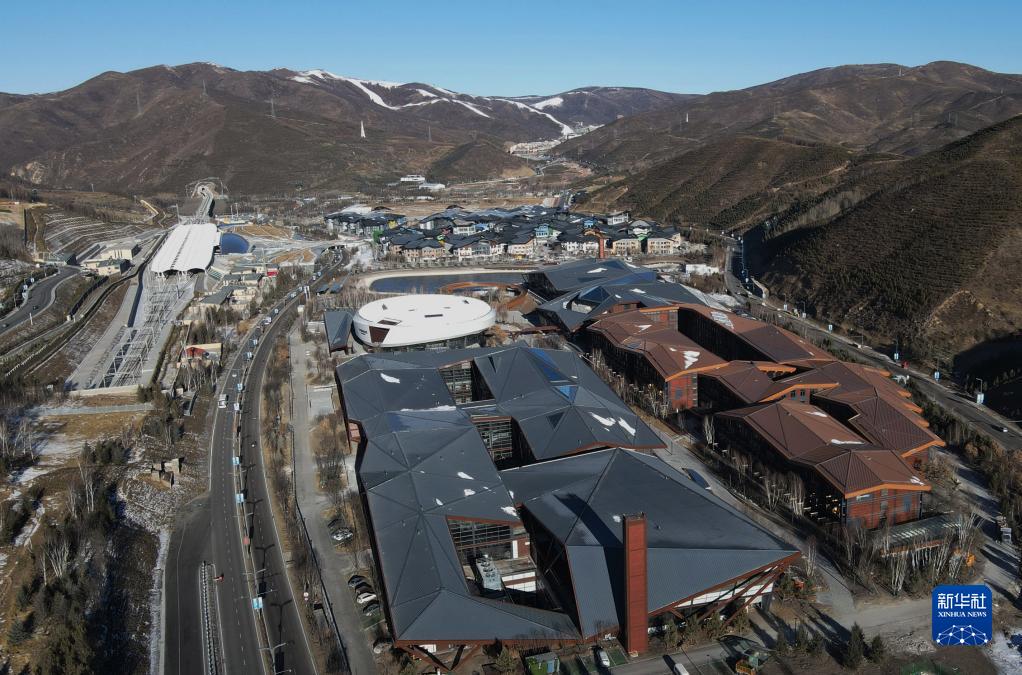 这是2021年12月28日拍摄的张家口市崇礼区太子城冰雪小镇和高铁站景色(无人机照片)。