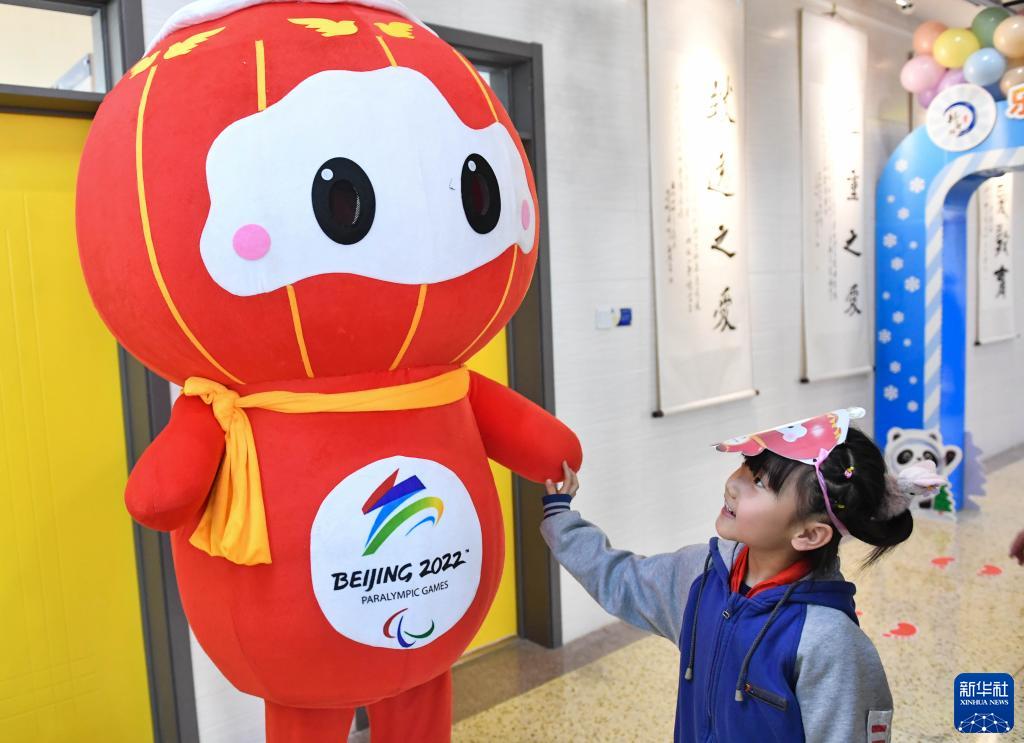 1月4日,在太原市新建路小学,二年级的学生和“雪容融”一起玩耍。