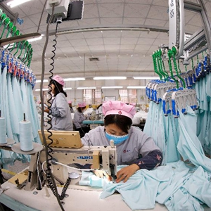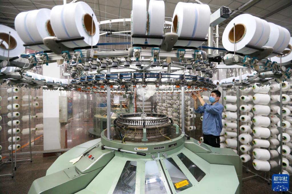 1月5日,在山东省青岛市即墨区的青岛颐和针织有限公司生产车间,纺织工人在生产服装面料。