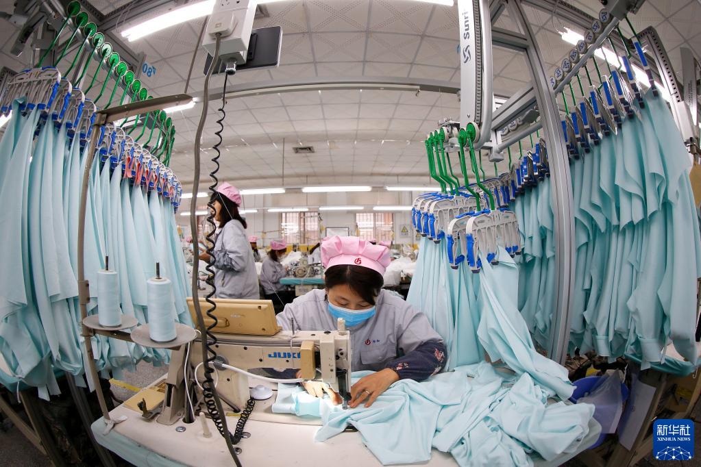 1月5日,山东省青岛市即墨区即发集团有限公司的工人在生产出口到海外市场的服装产品。