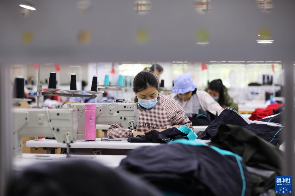 1月5日,在贵州省锦屏县三江镇潘寨大公田易地扶贫搬迁安置小区,一家服装企业的工人在生产车间加工服饰。