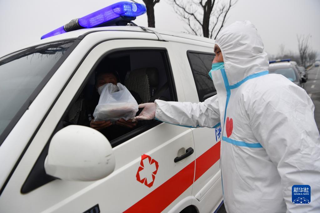 1月4日,在西安市雁塔区,志愿者畅璘将食品送至一位负责运输核酸检测样本的救护车驾驶员手中。