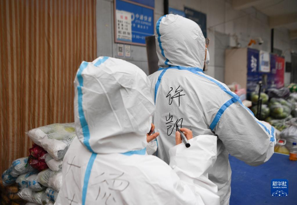1月5日,一名志愿者在德善爱心共享厨房创办人许凯的防护服上写名字。