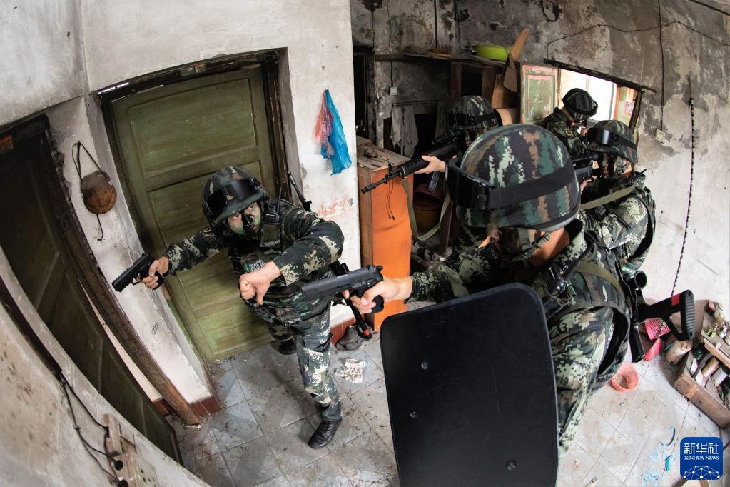 1月5日,武警广西总队北海支队官兵开展居民地反恐演练。