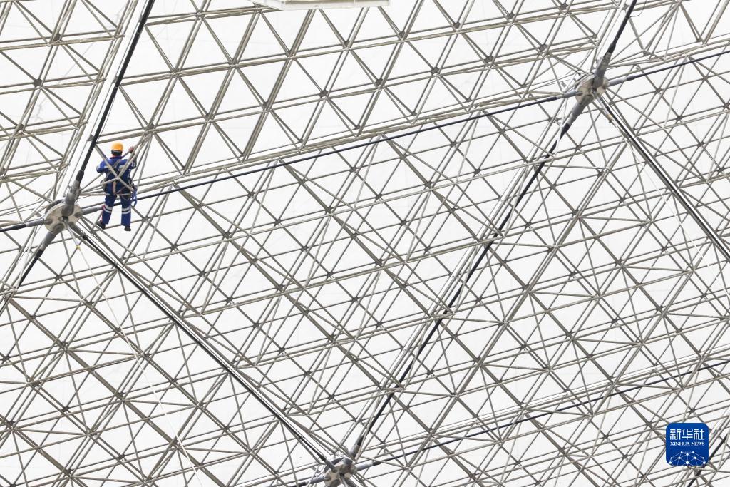 2021年12月17日,工作人员对“中国天眼”的反射面板进行维护保养。