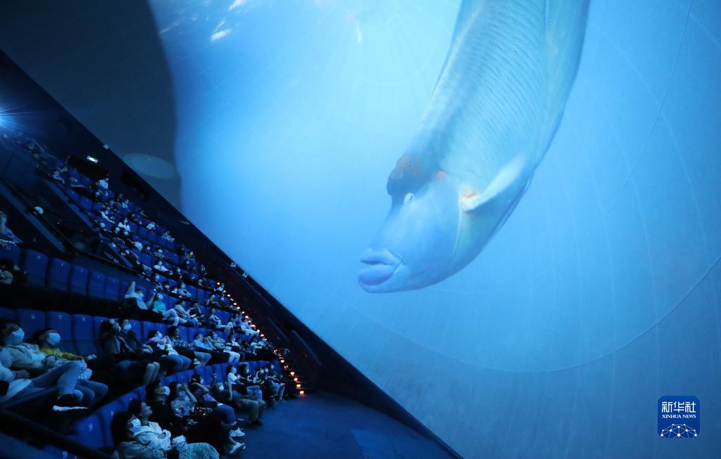 2021年5月2日,游客在上海科技馆影院内观看球幕电影《大堡礁探秘》。