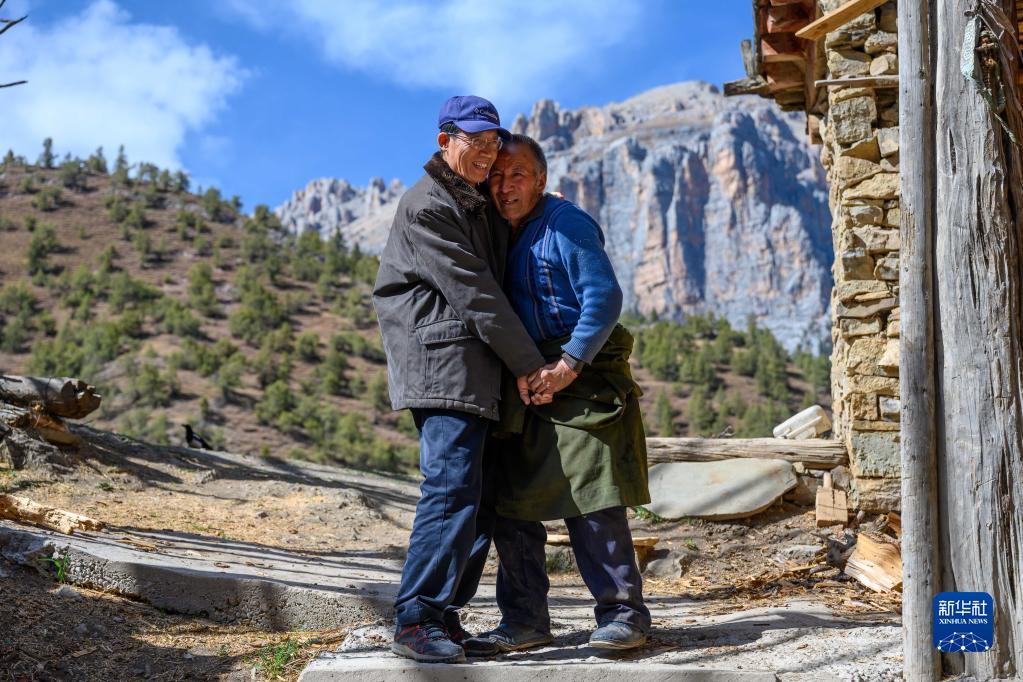 2021年5月3日,李纯民前往西藏昌都市类乌齐县伊日乡崩日村看望1979年下乡工作时结识的房东一家。这是房东的大儿子泽仁多加(右)在家门口热情欢迎他。1979年,李纯民响应国家号召来到类乌齐县工作,自此与西藏结缘。2001年到2006年,李纯民每年都会向青藏铁路指挥部捐款;过去十几年里,李纯民几乎每年都要进藏开展助学活动。