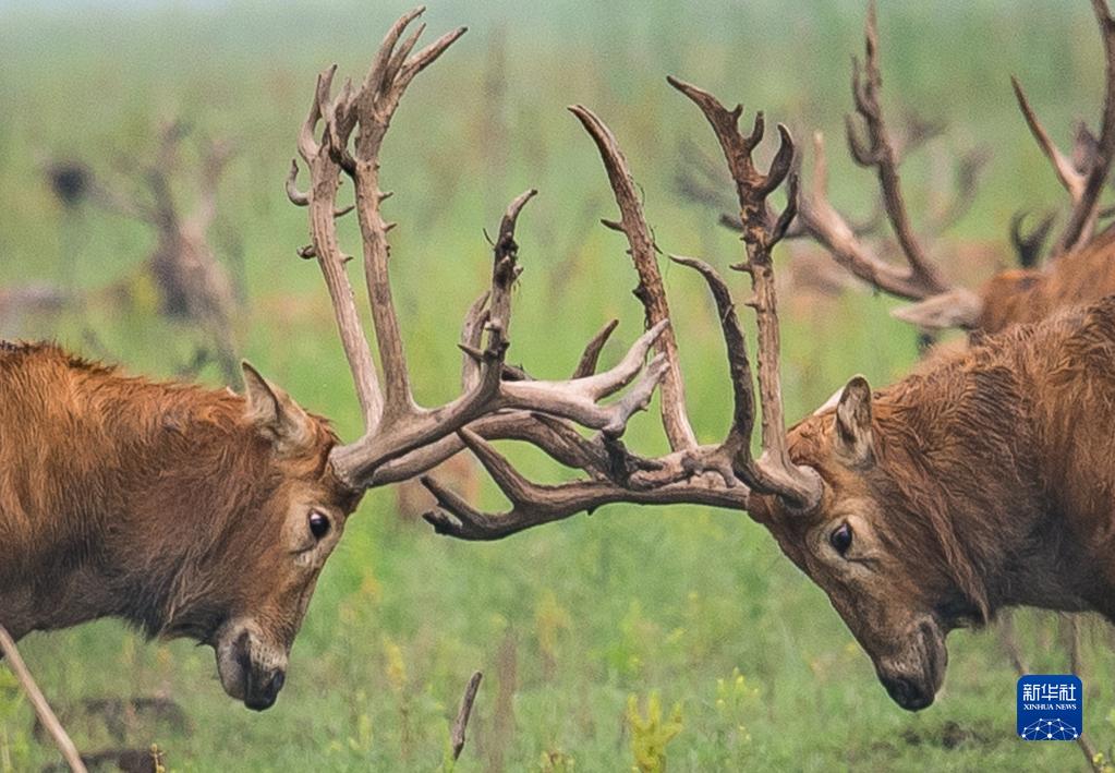 2021年5月17日,麋鹿在位于湖北省天鹅洲长江故道边的石首麋鹿国家级自然保护区内活动。