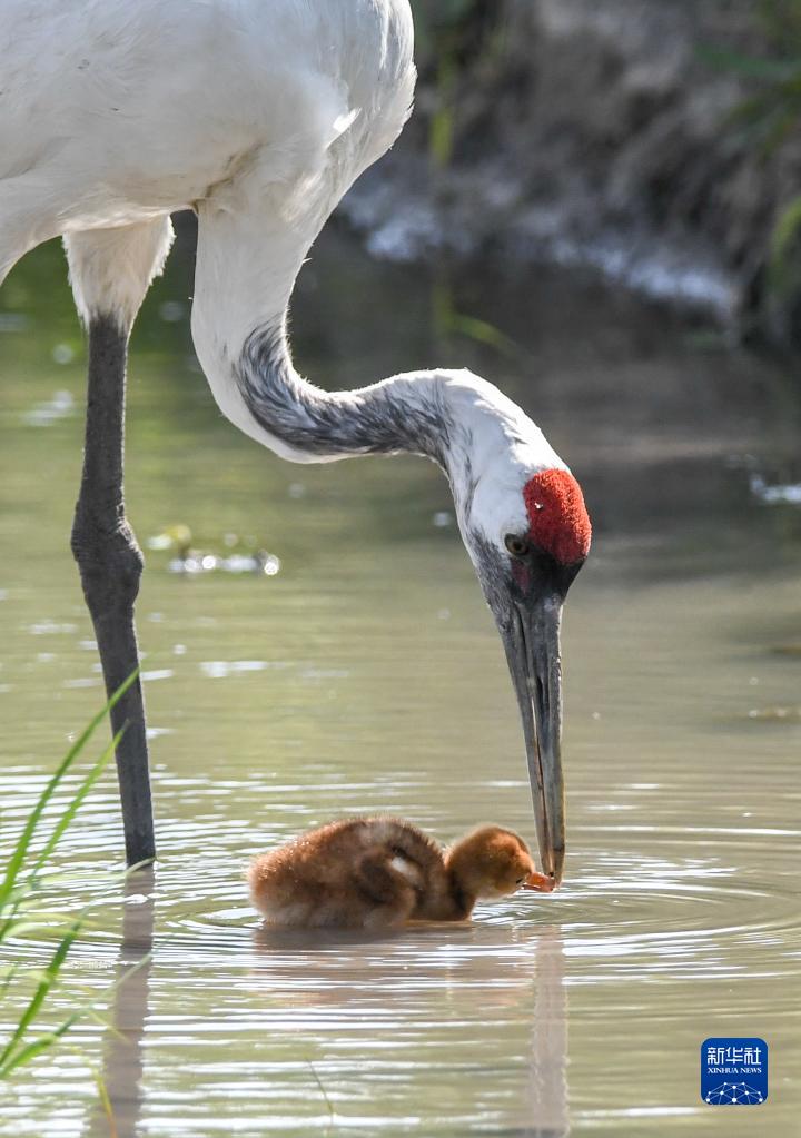 2021年6月20日至21日,一对由吉林莫莫格国家级自然保护区管理局人工繁育的丹顶鹤,在野化放归后成功繁殖出两只雏鹤。这是6月21日,丹顶鹤给雏鹤喂食。