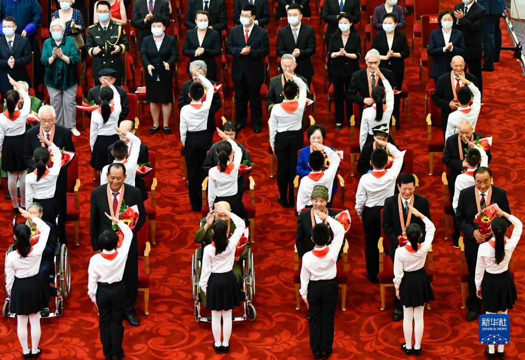 2021年6月29日,庆祝中国共产党成立100周年“七一勋章”颁授仪式在北京人民大会堂金色大厅隆重举行。这是少先队员向“七一勋章”获得者献花,敬礼致意。
