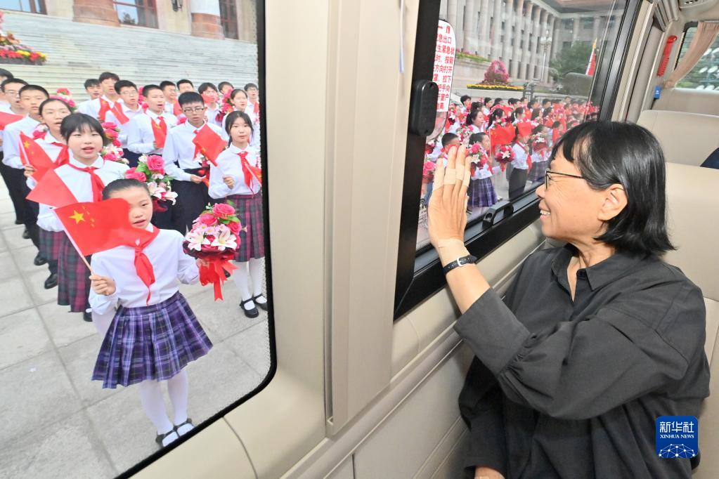 2021年6月29日,庆祝中国共产党成立100周年“七一勋章”颁授仪式在北京人民大会堂金色大厅隆重举行。这是“七一勋章”获得者张桂梅向青少年致意。