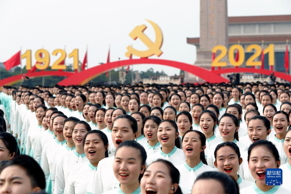 7月1日上午,庆祝中国共产党成立100周年大会在北京天安门广场隆重举行。这是合唱团在演唱。
