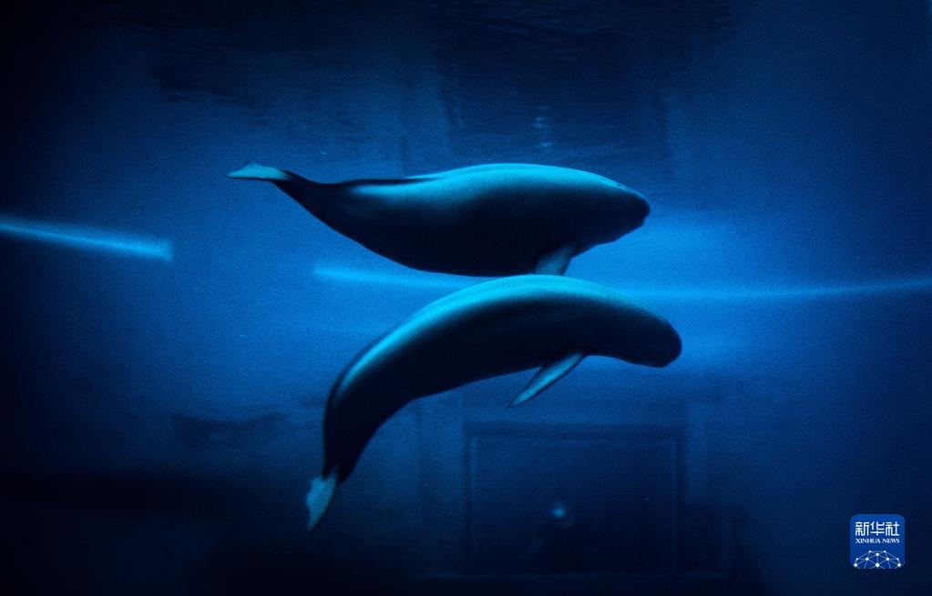 2021年7月5日,在中国科学院水生生物研究所白鱀豚馆里,一对江豚母子在水中游弋。