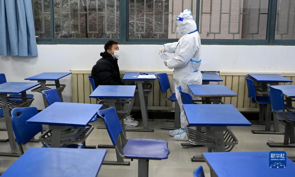 2021年12月25日,在2022年全国硕士研究生招生考试西安外国语大学考点隔离考区,监考人员在单人隔离考场查看考生信息。
