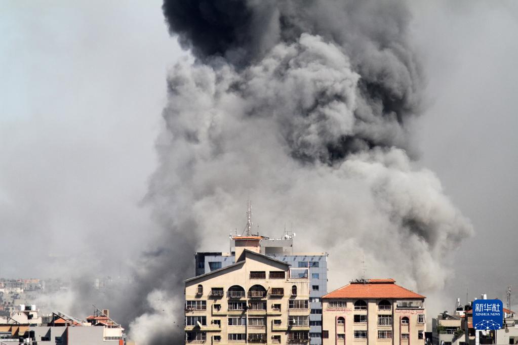 2021年5月15日,在加沙地带,美联社、半岛电视台等多家新闻媒体分支机构所在的大楼被以色列空袭后冒出浓烟。