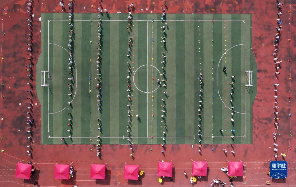 2021年5月22日,在安徽省六安市解放路第二小学,检测人员为学生进行核酸采样。