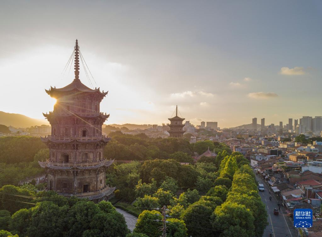 这是2021年7月8日拍摄的朝霞中的福建泉州开元寺东西塔。