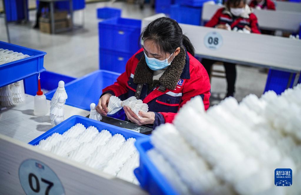 贵州省锦屏县的某羽毛球生产基地,工人在检查羽毛球的加工情况(1月5日摄)。
