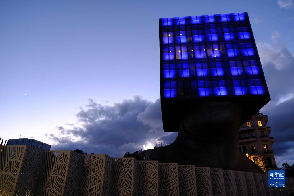 这是1月5日在法国南部城市尼斯拍摄的被蓝色灯光点亮的尼斯图书馆。